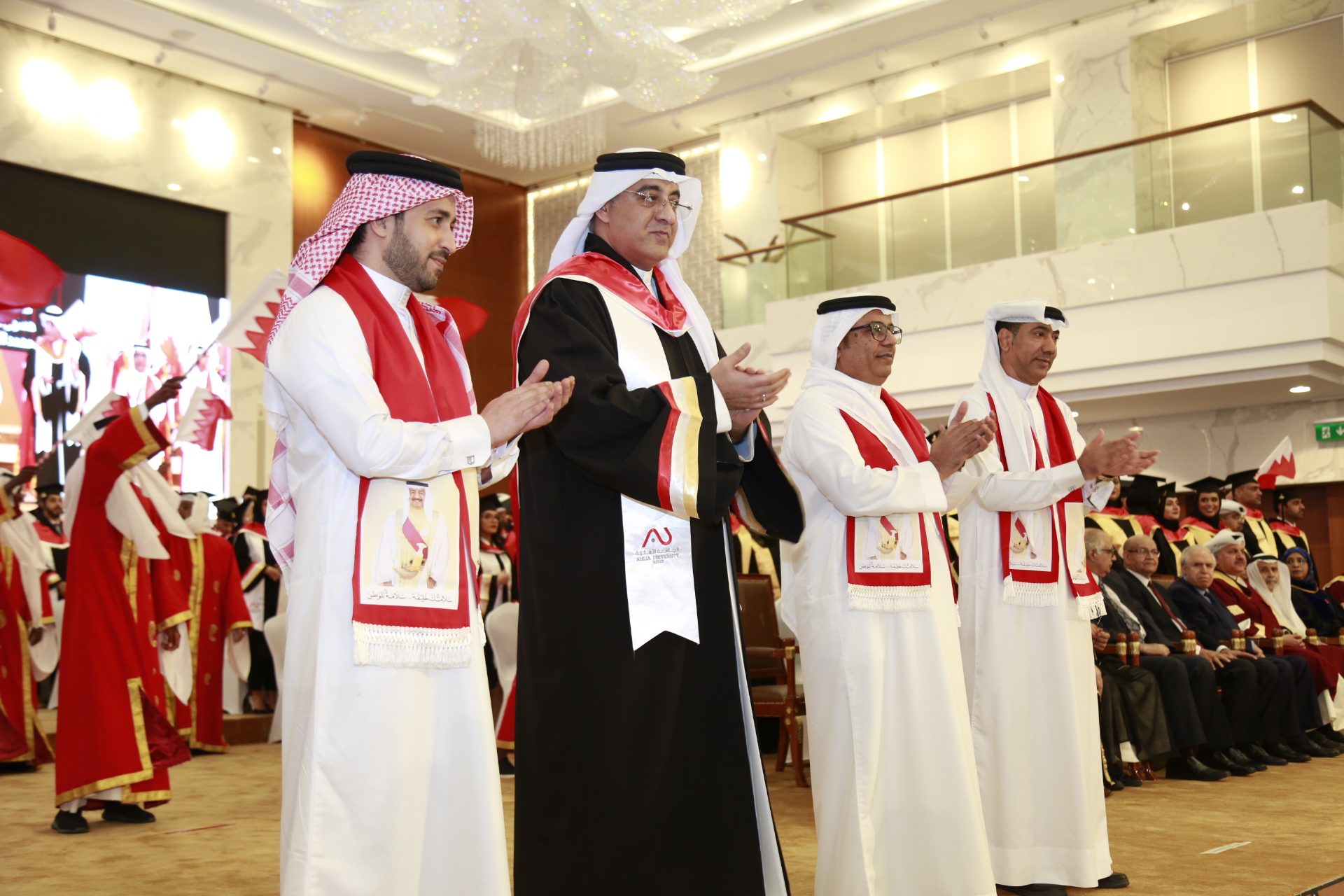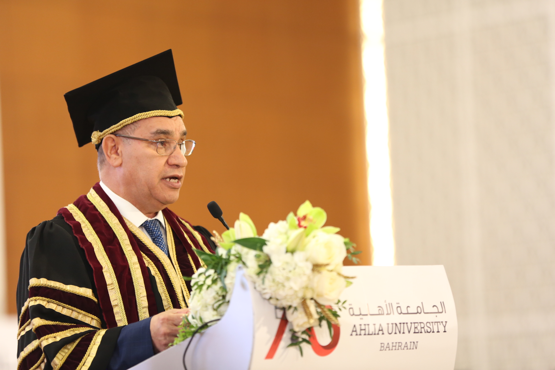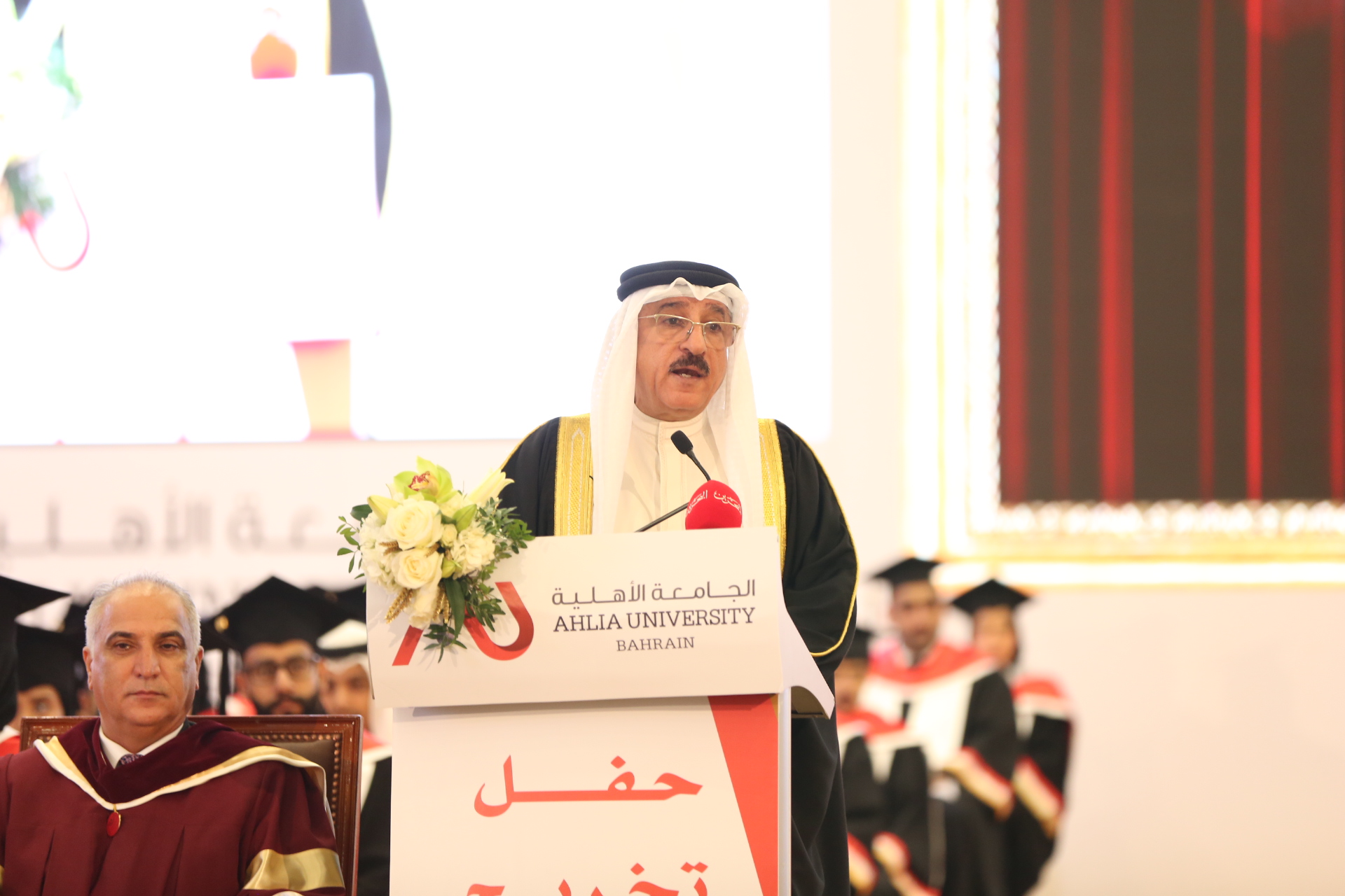 وقال:” بالأصالة عن نفسي، وبالنيابة عن جميع منتسبي الجامعة الأهلية، أهدي تخرج هذا الفوج من أبنائي الطلبة إلى عاهل البلاد المفدى حضرة صاحب الجلالة الملك حمد بن عيسى آل خليفة حفظه الله ورعاه، ورئيس الوزراء الموقر صاحب السمو الملكي الأمير خليفة بن سلمان آل خليفة حفظه الله ورعاه، وولي العهد نائب القائد الأعلى النائب الأول لرئيس مجلس الوزراء، صاحب السمو الملكي الأمير سلمان بن حمد آل خليفة ولي العهد الأمين نائب القائد الأعلى النائب الأول لرئيس مجلس الوزراء حفظه الله ورعاه، وللمنظومة التعليمية المباركة متمثلة في نائب رئيس مجلس الوزراء، رئيس المجلس الأعلى للتعليم والتدريب سمو الشيخ محمد بن مبارك آل خليفة”.
