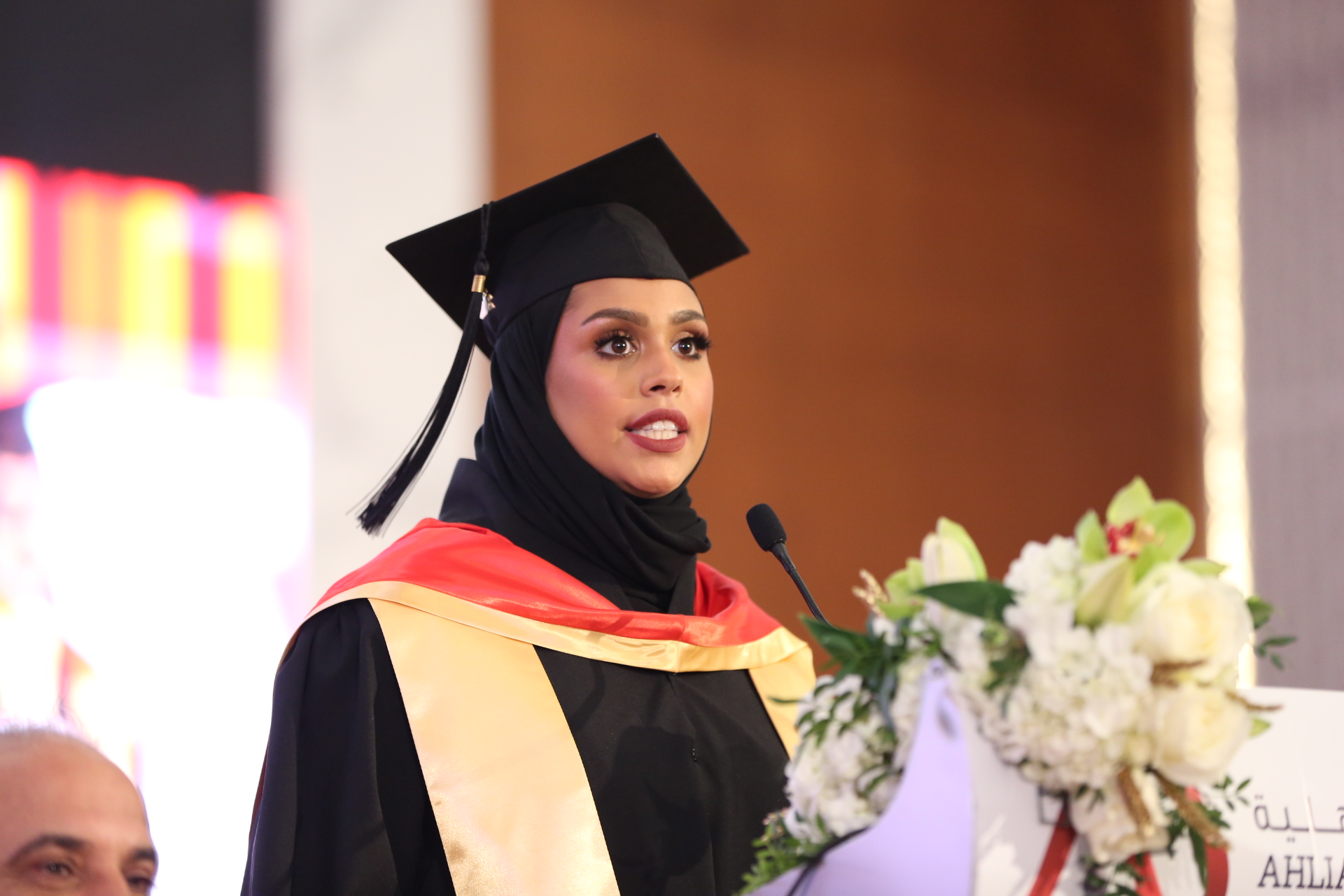 وأعربت أمينة الحمدان في الكلمة التي ألقتها باسم الخريجين والخريجات عن خالص الشكر والتقدير لصاحب السمو الملكي رئيس الوزراء على رعايته الكريمة، قائلة:” إنه لمن دواعي فخري واعتزازي، وأنا أتحدث بالنيابة عن زملائي وزميلاتي الخريجين والخريجات أمام حفلكم البهي، أن نكون الرعاية والحنو من قائد مسيرة، وباني نهضة وطن..”، مضيفة: “شكراً لكم.. شكراً لكم يا صاحب السمو على تفضلكم الكريم برعاية هذا المهرجان العلمي البديع في تلك الليلة العبقرية المباركة، وأنا أقف أمامكم متبركة بعباءة التخرج، متدثرة بكلمتي المتواضعة ، ومعتزة بما حملتموني إياه من مسئولية كبيرة كي ألقي كلمتي هذه بالأصالة عن نفسي ونيابة عن جميع خريجي الفوج الرابع عشر من طلبة الجامعة الأهلية”.