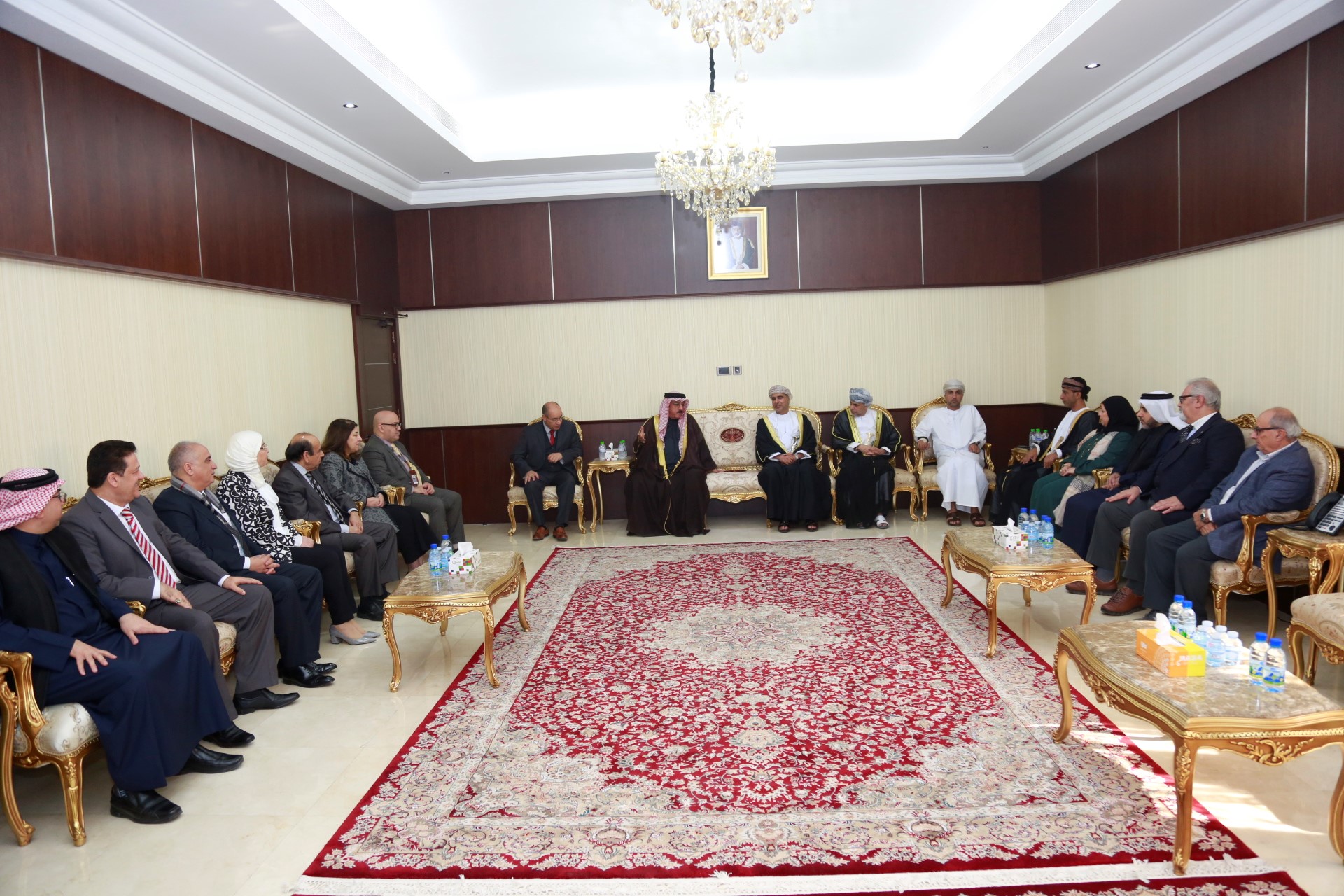وترأس الوفد، الذي كان في مقدمة مستقبليهم السفير العماني عبدالله بن راشد الديلوي والملحق الثقافي العماني وعدد من أعضاء السفارة، الرئيس المؤسس للجامعة الأهلية ورئيس مجلس الأمناء البروفيسور عبدلله الحواج ورئيس الجامعة البروفيسور منصور العالي ونواب الرئيس ومساعديه وعدد من العمداء والمستشارين وممثلي العلاقات العامة بالجامعة.