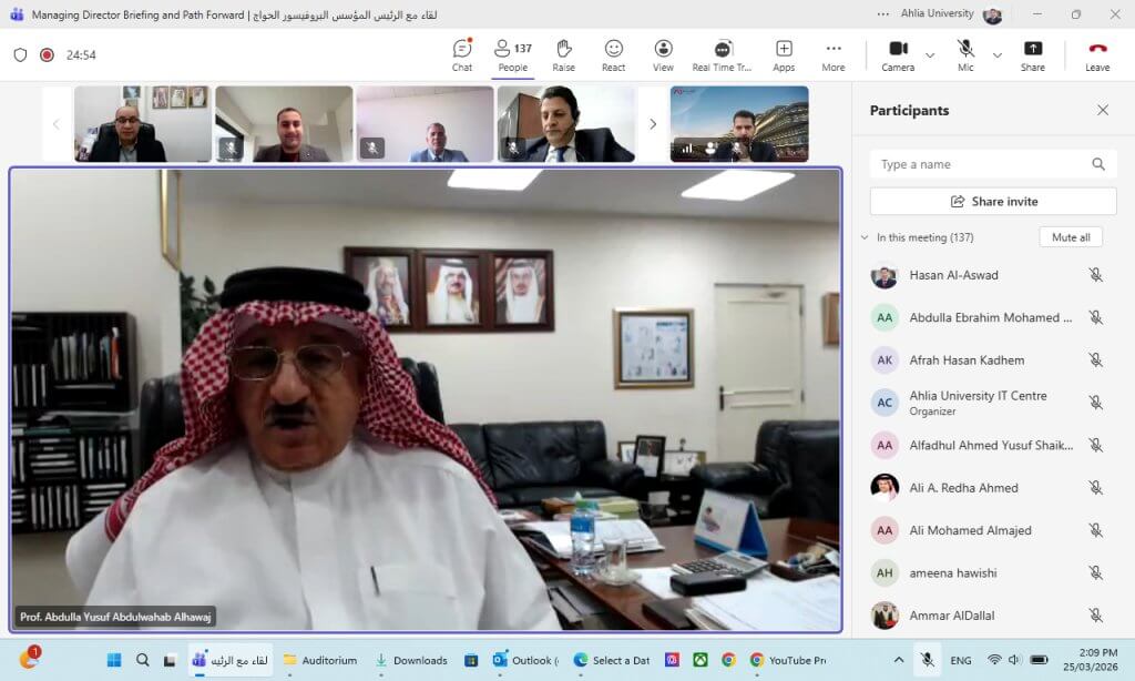 Ahlia University has reaffirmed its commitment to advancing the quality of education and ensuring the continuity of the academic process through an expanded virtual meeting focused on enhancing remote learning. The meeting was led by the Founding President and Chairman of the Board of Trustees, Professor Abdulla Yousif Abdulwahab Al-Hawaj, and attended by the University […]