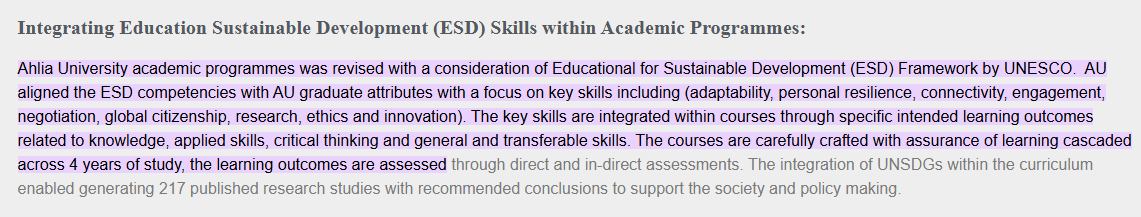 Ahlia University has systematically integrated sustainability and SDG-related topics throughout its undergraduate and graduate programs. In 2021, AU developed a new Sustainable Development Plan (2021–2025) prioritizing seven SDGs aligned with national strategies, with a special emphasis on Quality Education (SDG 4) ahlia.edu.bh ahlia.edu.bh. The academic programmes were comprehensively revised in structure and learning outcomes to align with SDG 4, ensuring that many courses and research projects explicitly address sustainable development challenges ahlia.edu.bh ahlia.edu.bh. AU reports that “academic programmes were revised with a consideration of Education for Sustainable Development (ESD) Framework by UNESCO”, aligning ESD competencies with the university’s graduate attributes ahlia.edu.bh. This alignment introduced new sustainability topics into specific course content across disciplines to “create a cultural mindset for the future generation”, embedding SDG concepts into the curriculum ahlia.edu.bh. Notably, AU’s integration of SDGs into coursework has spurred significant scholarly output – over 217 research studies (2020–2023) were published by faculty and students on sustainability-related topics, contributing recommendations to support society and policy-making ahlia.edu.bh.