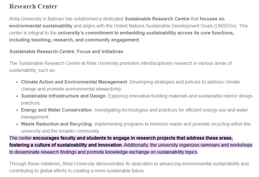 Ahlia University in Bahrain has established a dedicated Sustainable Research Centre that focuses on environmental sustainability and aligns with the United Nations Sustainable Development Goals (UNSDGs). This center is integral to the university’s commitment to embedding sustainability across its core functions, including teaching, research, and community engagement.