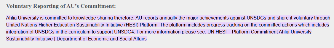 AU systematically tracks its progress on sustainability initiatives and learning outcomes as part of its contributions to the United Nations Higher Education Sustainability Initiative (UN HESI). Each year, the university compiles a report of major achievements related to the SDGs, including how well sustainability has been integrated into the curriculum (supporting SDG 4 on education) ahlia.edu.bh. This voluntary reporting is shared on the UN HESI platform, which also acts as a progress tracker for AU’s commitments ahlia.edu.bh. By doing so, Ahlia effectively measures how many courses, programs, and research outputs align with SDGs and reflects on areas for enhancement. The university notes that its “journey towards UNSDGs is annually assessed and reported”, both for internal strategy and external accountability ahlia.edu.bh. This annual self-assessment ensures that sustainability literacy targets (such as the inclusion of ESD outcomes in all programs) are monitored and met over time.