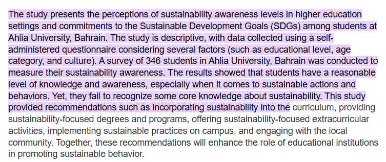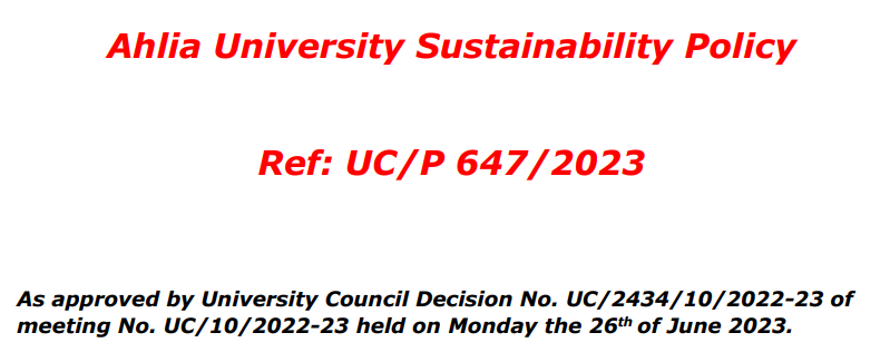 Sustainability literacy at Ahlia University is reinforced by top-level institutional strategies and formal policies that signal a strong commitment across the university’s mission and operations. Several key strategies and policies enacted since 2020 provide a framework that sustains and advances education for sustainable development across all disciplines: