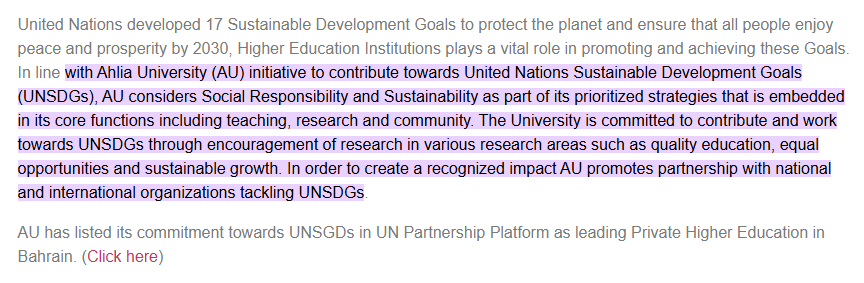 Ahlia University (AU) in Bahrain has adopted a comprehensive approach to sustainability literacy, embedding United Nations Sustainable Development Goals (SDGs) into its teaching, research, and community engagement since 2020. In line with Times Higher Education (THE) Impact Rankings criteria, AU demonstrates clear evidence of sustainability and SDG integration across curricula, student outcomes, faculty development, co-curricular programs, assessment initiatives, and institutional policies. The university’s efforts have been recognized globally – AU was ranked 14th (2021) and 23rd (2022) worldwide in THE Impact Rankings for Quality Education (SDG 4), and 1st in Bahrain ahlia.edu.bh. The following report details AU’s initiatives from 2020 onward, with official evidence, illustrating how sustainability literacy is fostered across the institution.