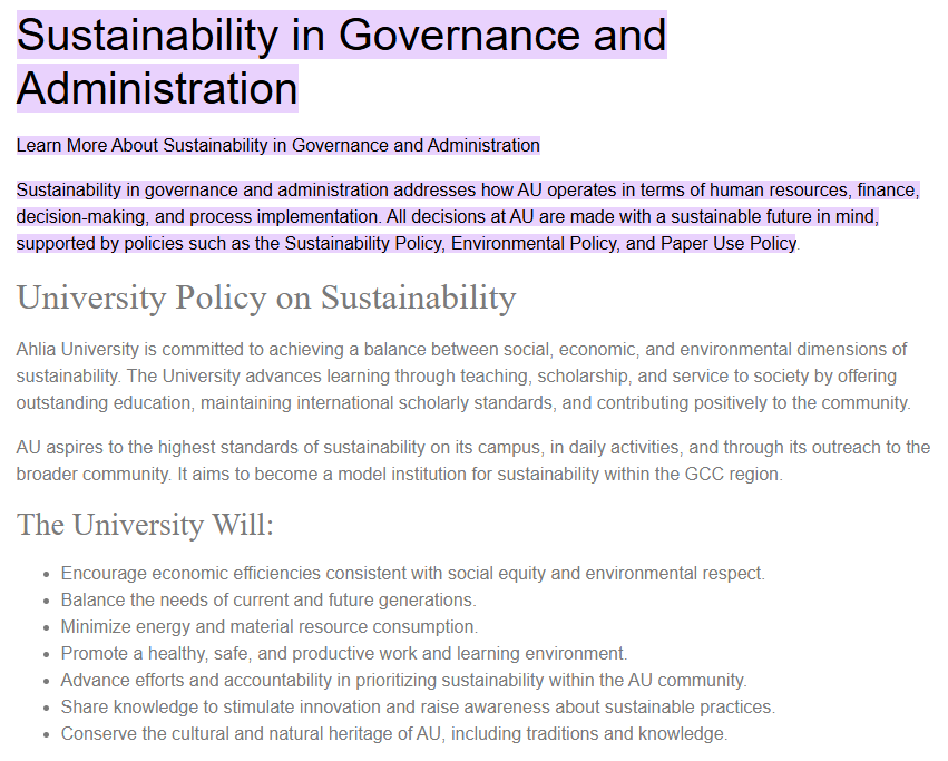 Internally, Ahlia’s Sustainable Development Committee, in coordination with the Centre for Accreditation and Quality Assurance (CAQA), oversees the integration of sustainability in academics and likely mentors faculty in this process ahlia.edu.bh. This committee, active since 2020, works across departments to ensure faculty incorporate SDG themes and to share resources for sustainability teaching. Moreover, AU provides incentives for faculty engagement with sustainability scholarship – the Sustainability Policy explicitly “encourage[s] academic faculty and students to publish research covering a wide range of sustainability aspects” ahlia.edu.bh. By promoting research on sustainability (and even funding or recognition for such research), the university indirectly trains faculty to deepen their expertise in sustainability topics, which then informs their teaching.