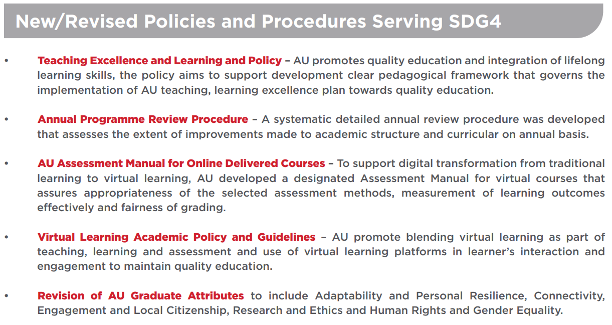 AU development in the area of SDG4 was selected to be presented as a case study in national and international debates and conferences. AU quality of education was measured during COVID-19 and learner satisfaction level was 81%. Conferences and Research Forums were conducted that focused on Education Quality and Management Practices that led to producing more than 3 Scopus indexed proceedings highlighting di‑erent best practices and recommendation for sustaining quality education.