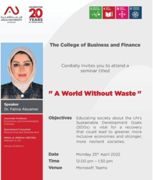 AU revised its graduate attributes and academic programmes to be aligned with UNSDGs by integrating new topics in specific courses contents to create a cultural mindset for the future generation. A new Teaching, Learning Excellence Policy was developed aligned with UNSDGs and focusing on life-long learning.